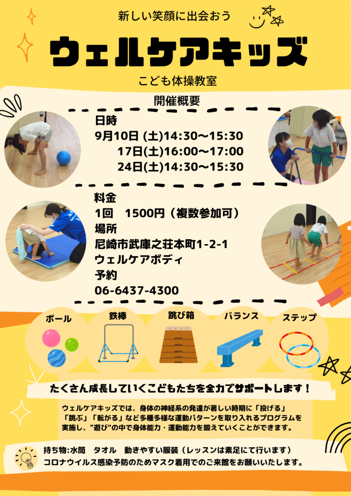 8月に行われた「夏のこども体操教室」に引き続き、下記の日程で「ウェルケアキッズ こども体操教室」を開催いたします。