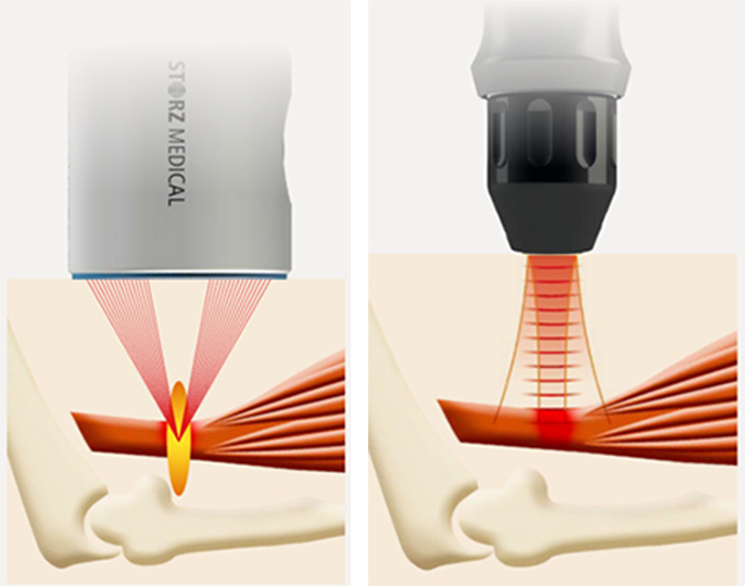 保存療法を6か月以上受けても効果の見られない難治性の足底腱膜炎の除痛治療に効果を発揮します。STORZ MEDICAL独自開発の円筒型衝撃波コイルにより、安定した衝撃波エネルギーの発生と操作性の向上の両方を可能にしました。ハンドピースを患部に当て、照射ボタンを押すだけで治療を開始することができます。また、衝撃波エネルギーの到達深度を2種類のスタンドオフによって調整できることから、より安全かつ快適な治療が可能となっています。